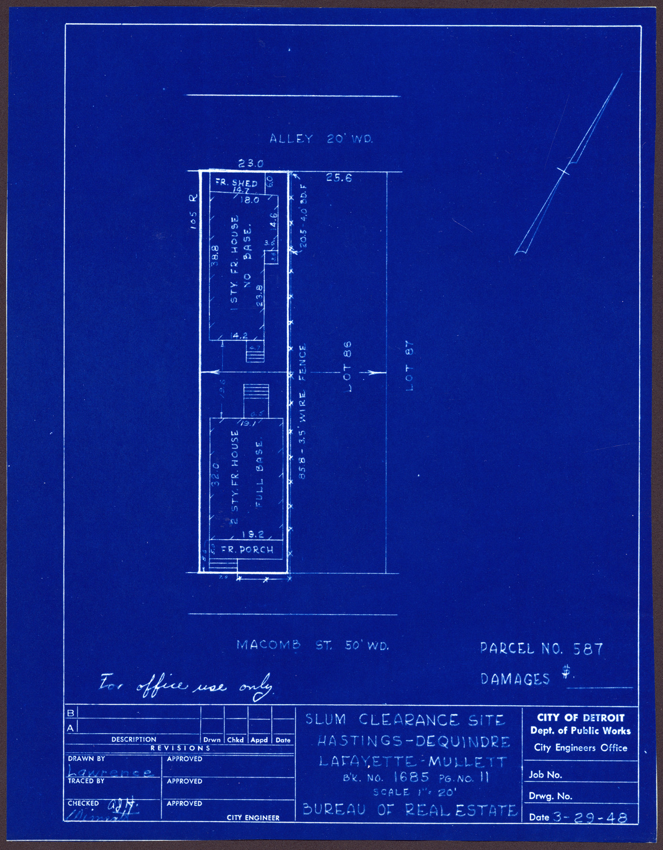 Part of a collection that contains condemnation files, photographs, blueprints and descriptions of slum clearance housing parcels for the City of Detroit. Of particular note are areas which included the neighborhoods known as Paradise Valley, Black Bottom, Corktown and the Jeffries Housing Project.