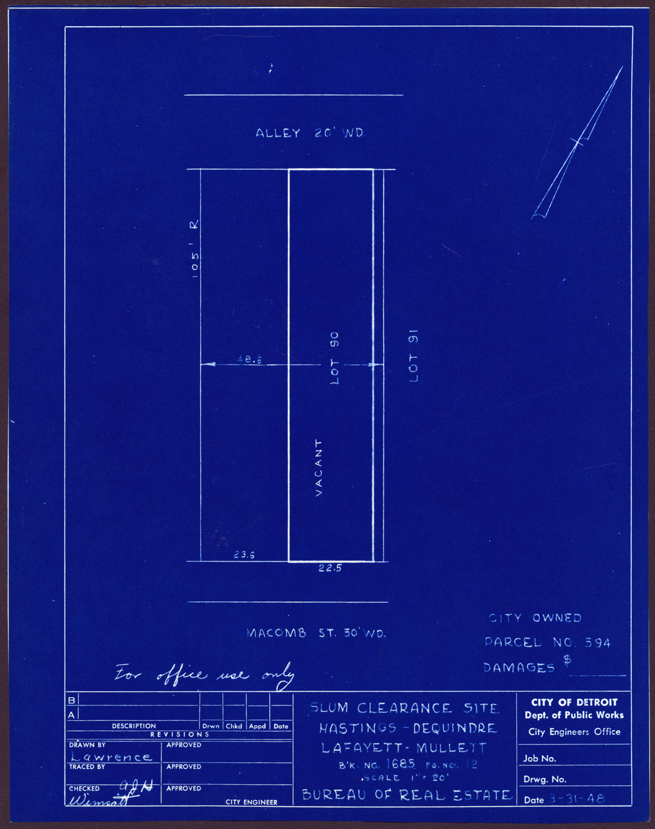 Plot plan for property located on Macomb, city owned parcel 594. Recorded on blueprint: "Slum clearance site; Hastings, Dequindre, Lafayette, Mullett."