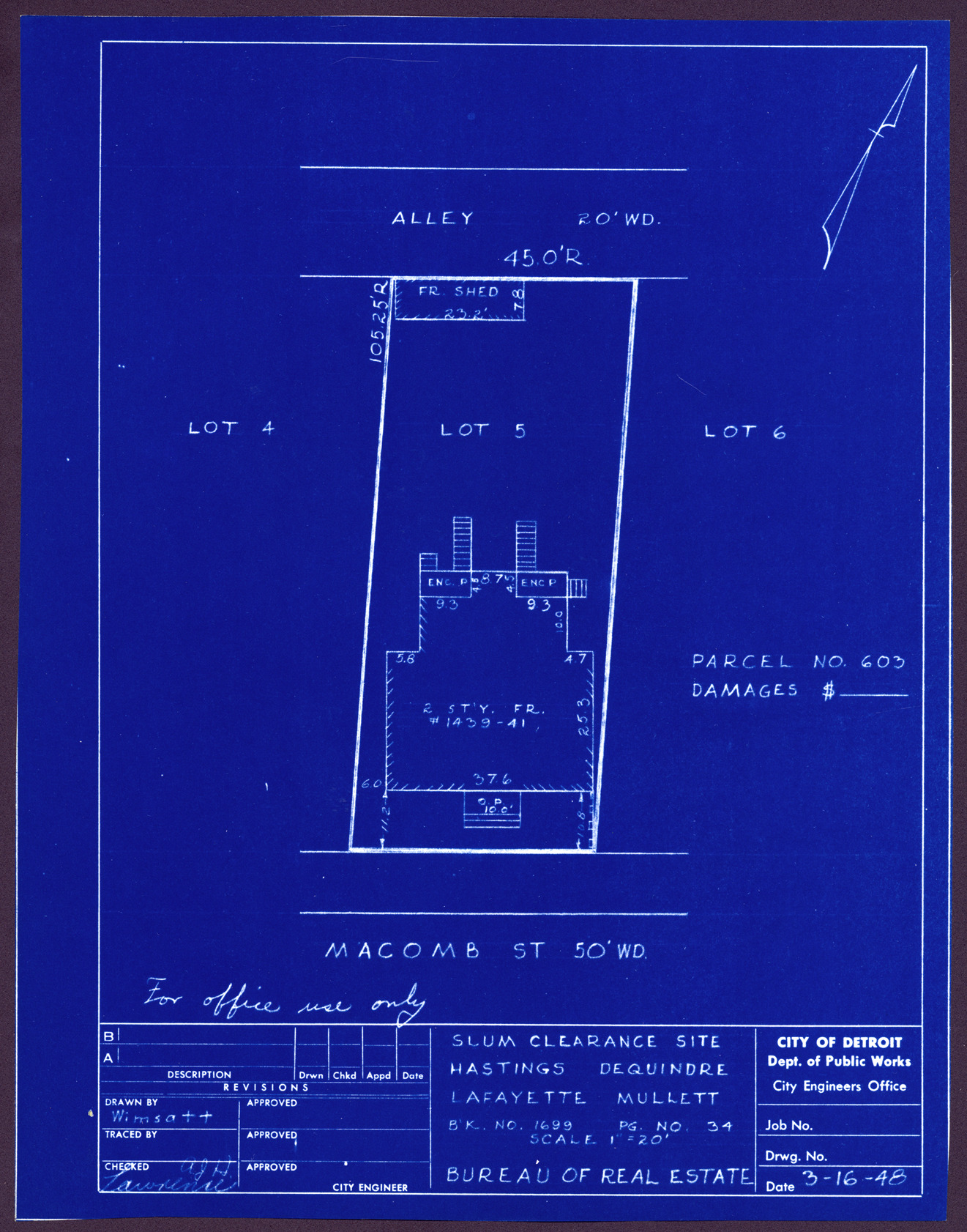Plot plan for property located on Macomb, parcel 603. Recorded on blueprint: "Slum clearance site; Hastings, Dequindre, Lafayette, Mullett."