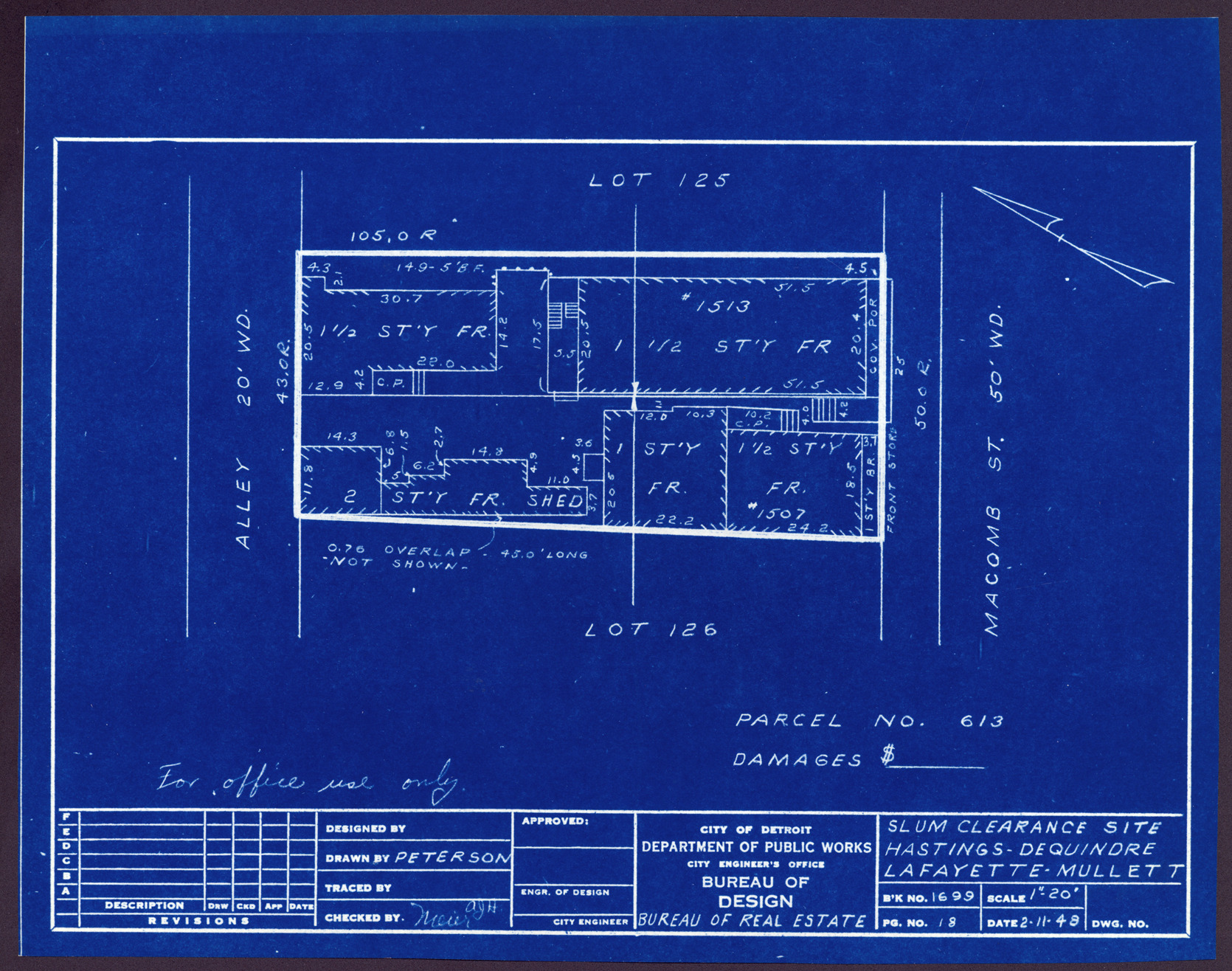 Part of a collection that contains condemnation files, photographs, blueprints and descriptions of slum clearance housing parcels for the City of Detroit. Of particular note are areas which included the neighborhoods known as Paradise Valley, Black Bottom, Corktown and the Jeffries Housing Project.