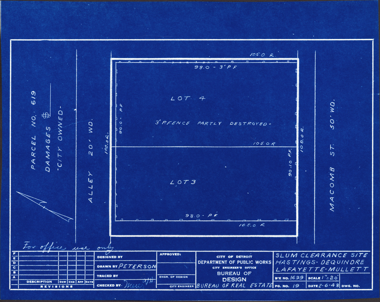 Part of a collection that contains condemnation files, photographs, blueprints and descriptions of slum clearance housing parcels for the City of Detroit. Of particular note are areas which included the neighborhoods known as Paradise Valley, Black Bottom, Corktown and the Jeffries Housing Project.
