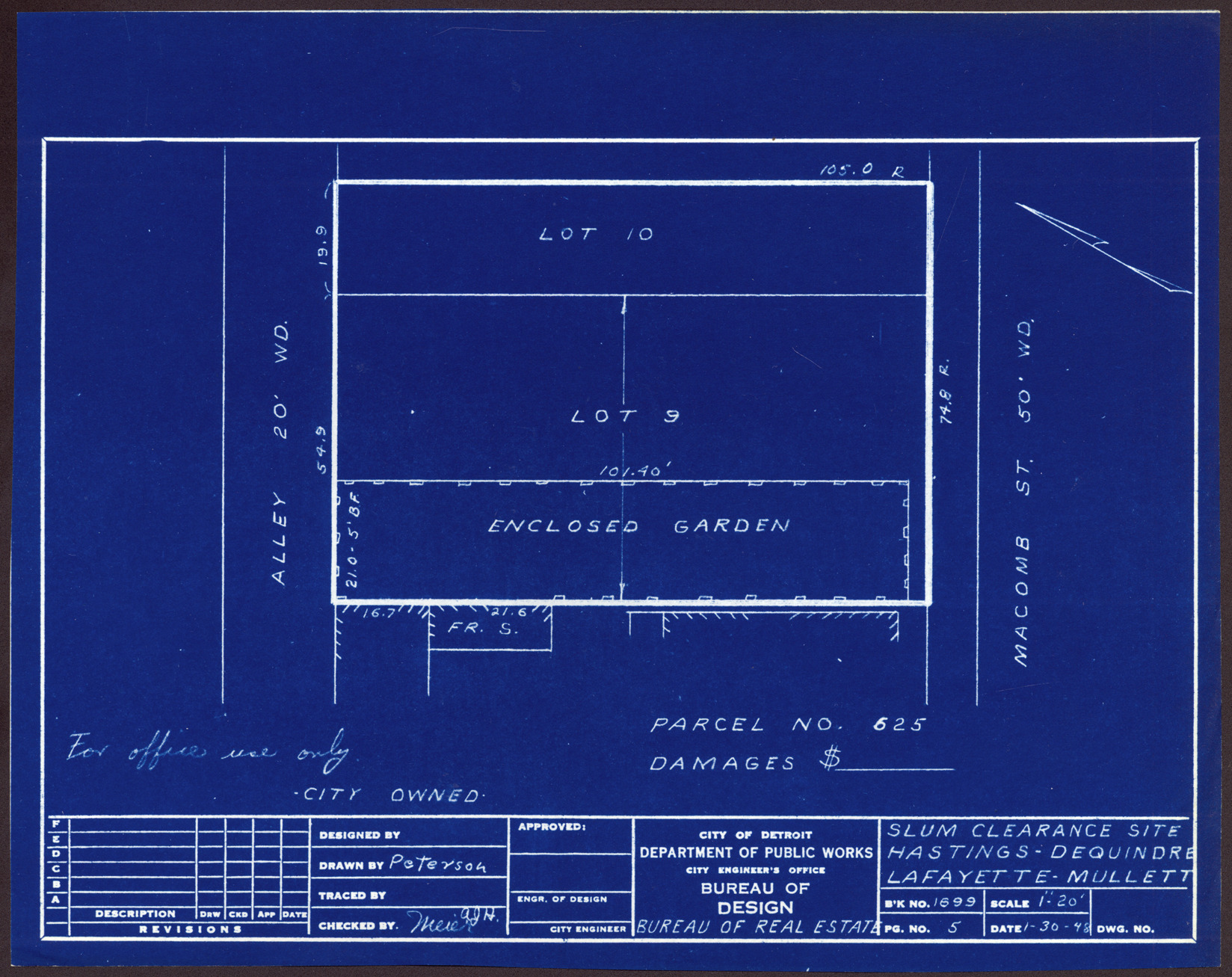 Plot plan for property located on Macomb, city owned parcel 625. Recorded on blueprint: "Slum clearance site; Hastings, Dequindre, Lafayette, Mullett."