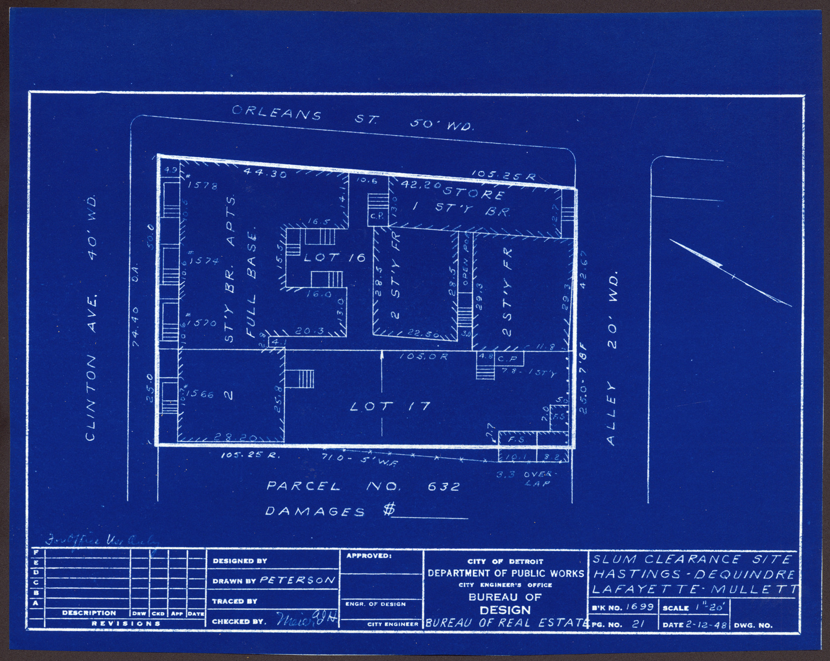 Part of a collection that contains condemnation files, photographs, blueprints and descriptions of slum clearance housing parcels for the City of Detroit. Of particular note are areas which included the neighborhoods known as Paradise Valley, Black Bottom, Corktown and the Jeffries Housing Project.
