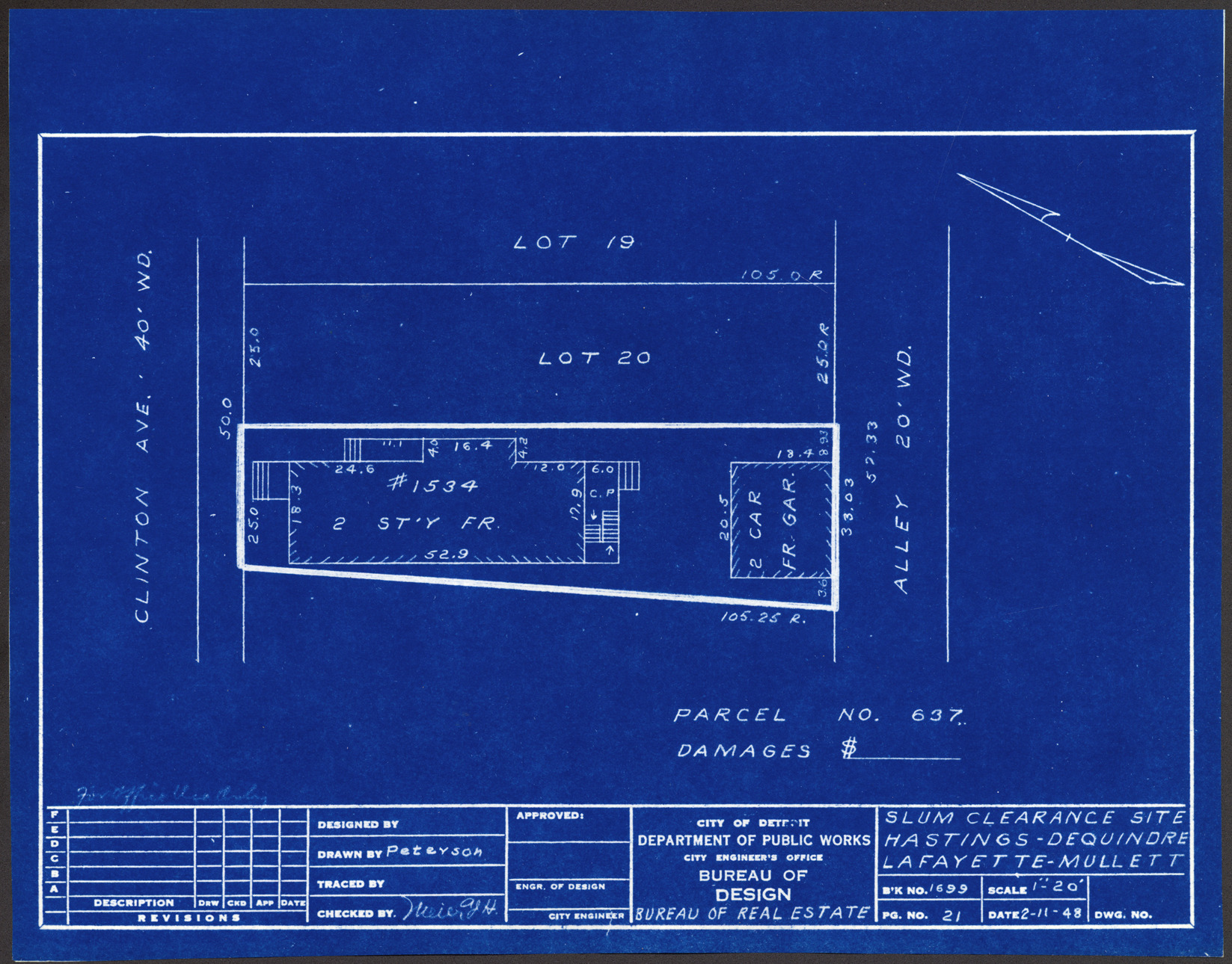 Plot plan for property located on Clinton, parcel 637. Recorded on blueprint: "Slum clearance site; Hastings, Dequindre, Lafayette, Mullett."