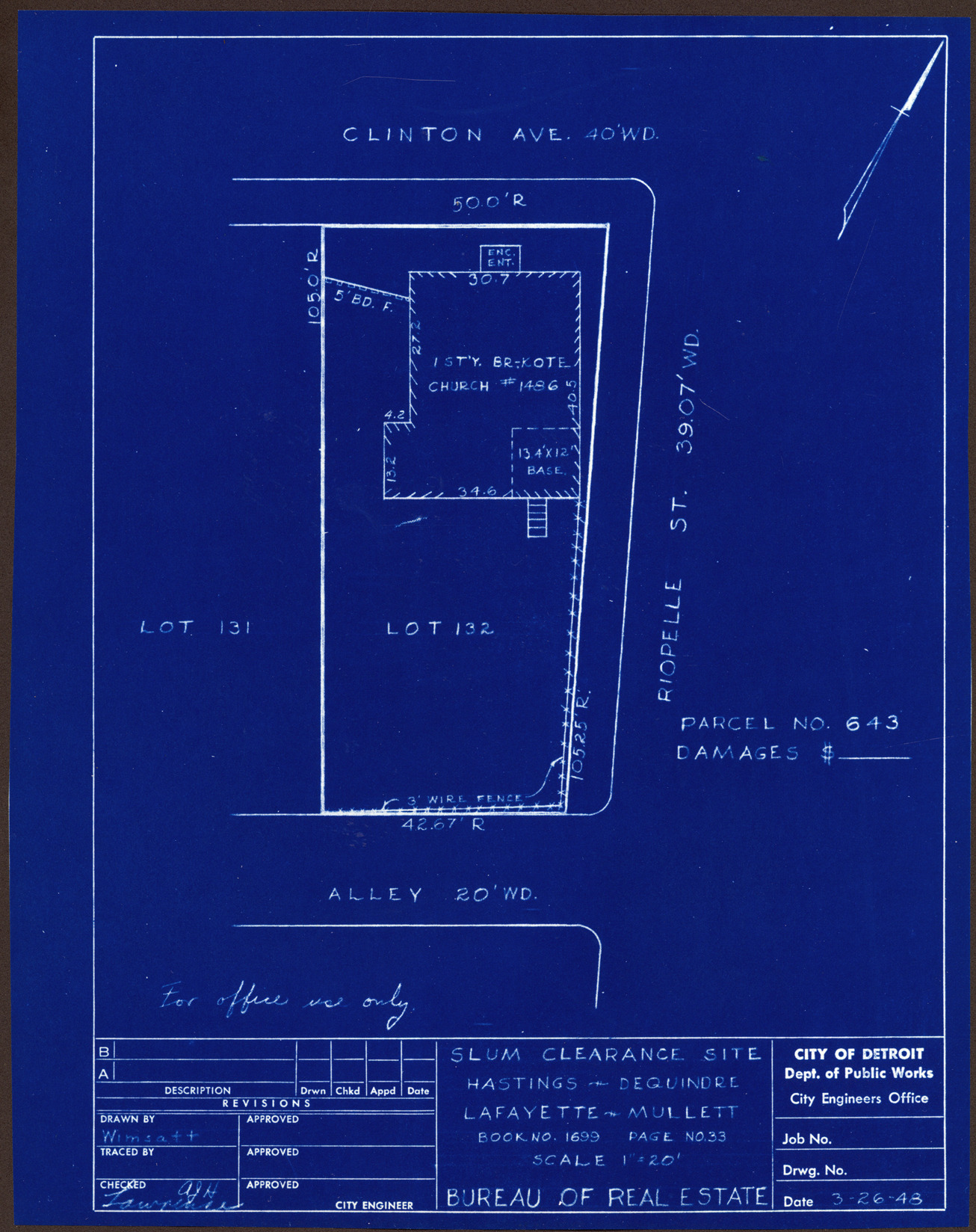 Plot plan for property located on the corner of Clinton and Riopelle, parcel 643. Recorded on blueprint: "Slum clearance site; Hastings, Dequindre, Lafayette, Mullett."