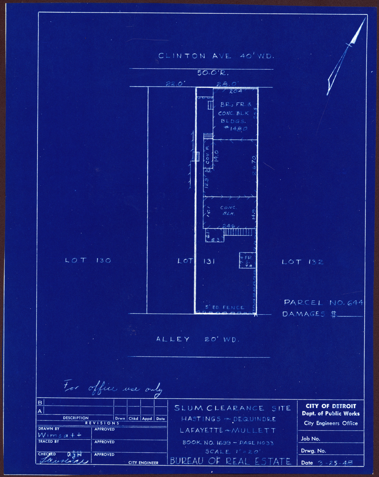 Plot plan for property located on Clinton, parcel 644. Recorded on blueprint: "Slum clearance site; Hastings, Dequindre, Lafayette, Mullett."