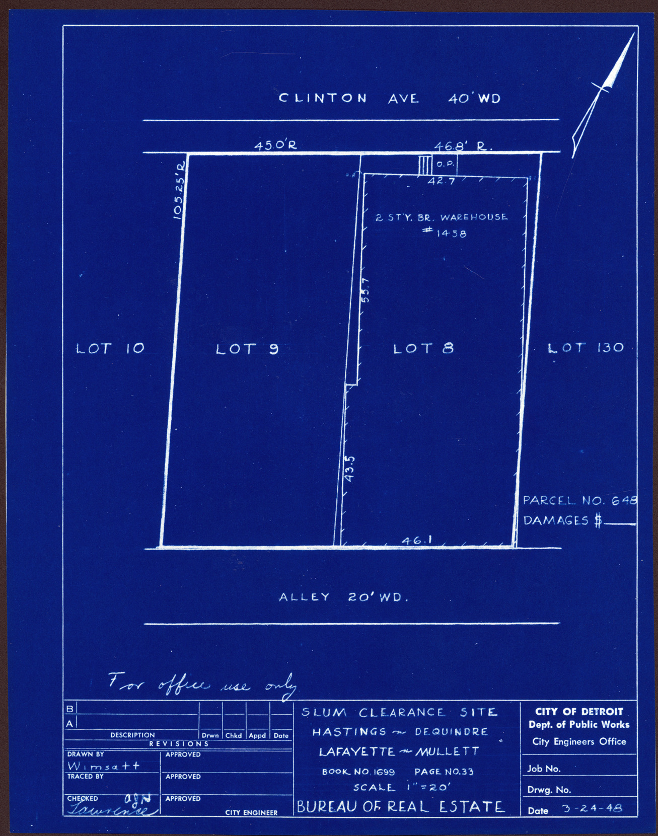 Plot plan for property located on Clinton, parcel 648. Recorded on blueprint: "Slum clearance site; Hastings, Dequindre, Lafayette, Mullett."