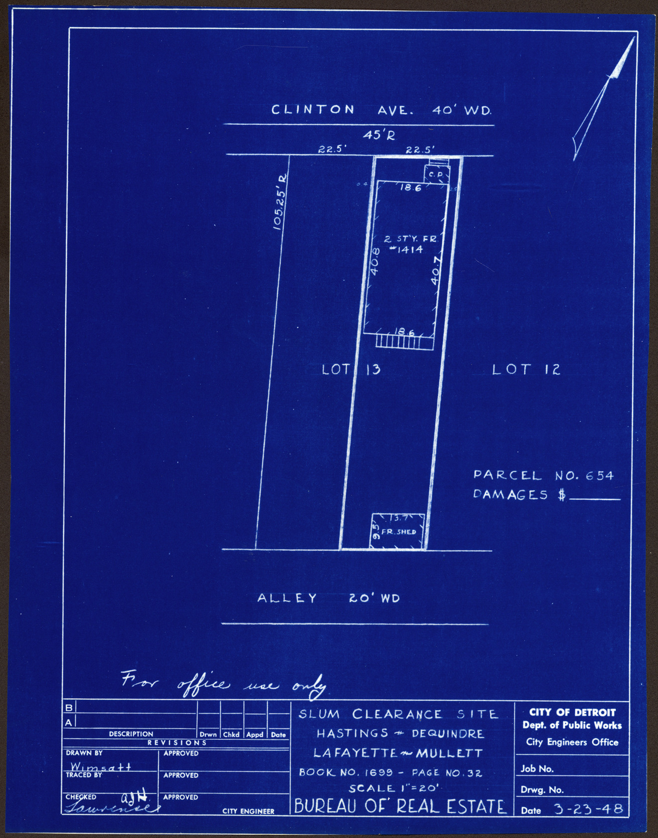 Plot plan for property located on Clinton, parcel 654. Recorded on blueprint: "Slum clearance site; Hastings, Dequindre, Lafayette, Mullett."