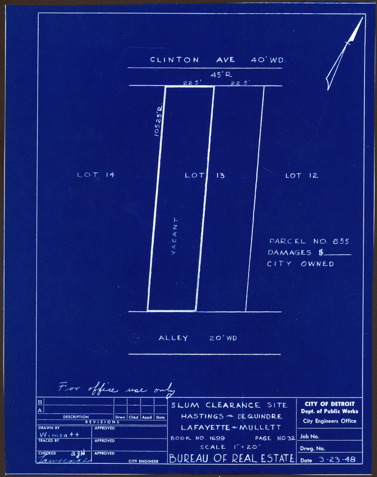 Plot plan for property located on Clinton, city owned parcel 655. Recorded on blueprint: "Slum clearance site; Hastings, Dequindre, Lafayette, Mullett."