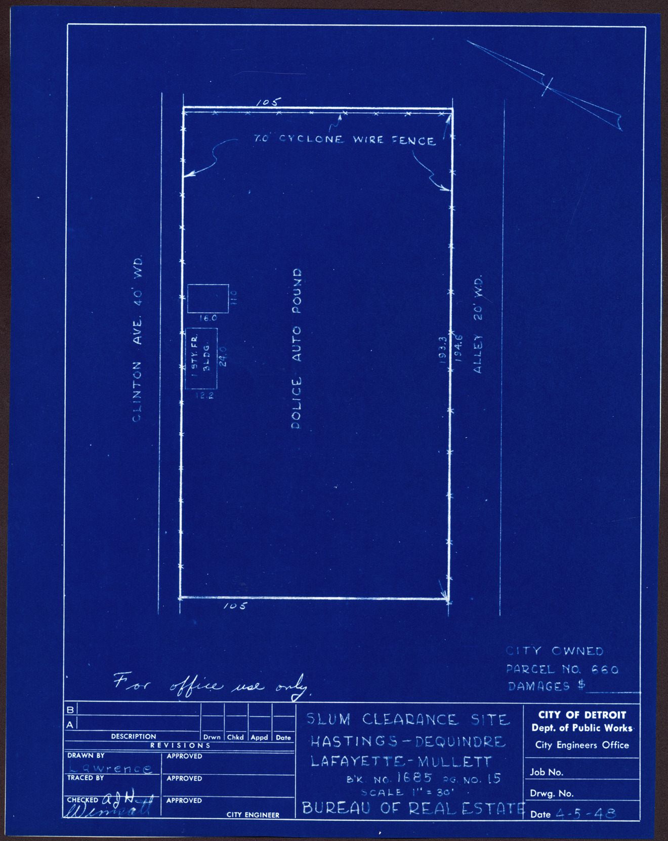 Plot plan for property located on Clinton, city owned parcel 660. Written on blueprint: "Police auto pound." Recorded on blueprint: "Slum clearance site; Hastings, Dequindre, Lafayette, Mullett."