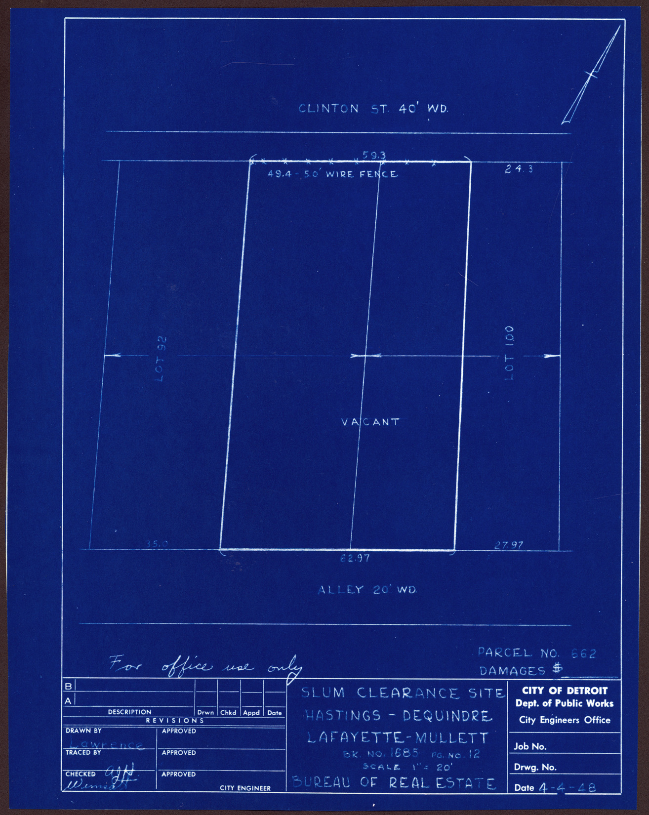 Part of a collection that contains condemnation files, photographs, blueprints and descriptions of slum clearance housing parcels for the City of Detroit. Of particular note are areas which included the neighborhoods known as Paradise Valley, Black Bottom, Corktown and the Jeffries Housing Project.