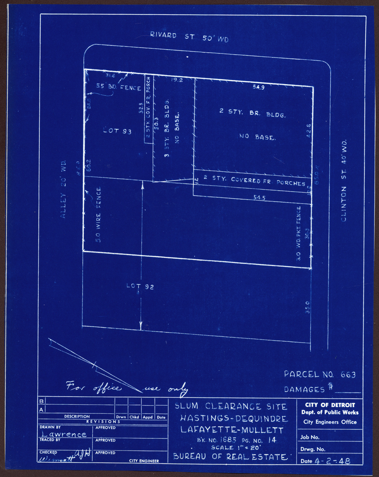 Plot plan for property located on the corner of Clinton and Rivard, parcel 663. Recorded on blueprint: "Slum clearance site; Hastings, Dequindre, Lafayette, Mullett."