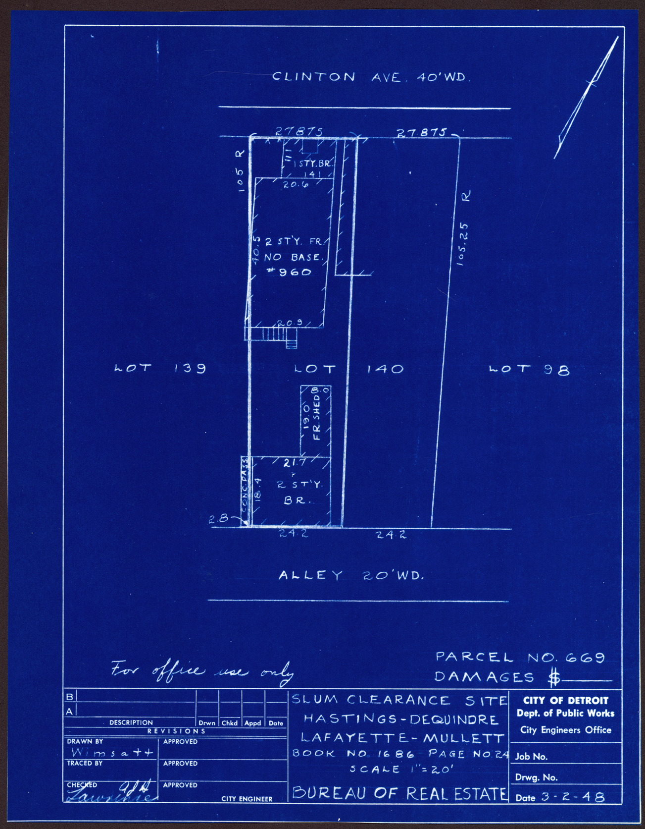 Part of a collection that contains condemnation files, photographs, blueprints and descriptions of slum clearance housing parcels for the City of Detroit. Of particular note are areas which included the neighborhoods known as Paradise Valley, Black Bottom, Corktown and the Jeffries Housing Project.