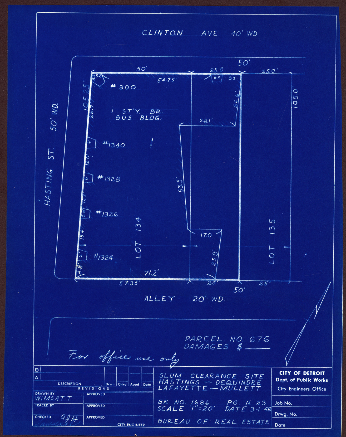 Plot plan for property located on the corner of Clinton and Hastings, parcel 676. Recorded on blueprint: "Slum clearance site; Hastings, Dequindre, Lafayette, Mullett."