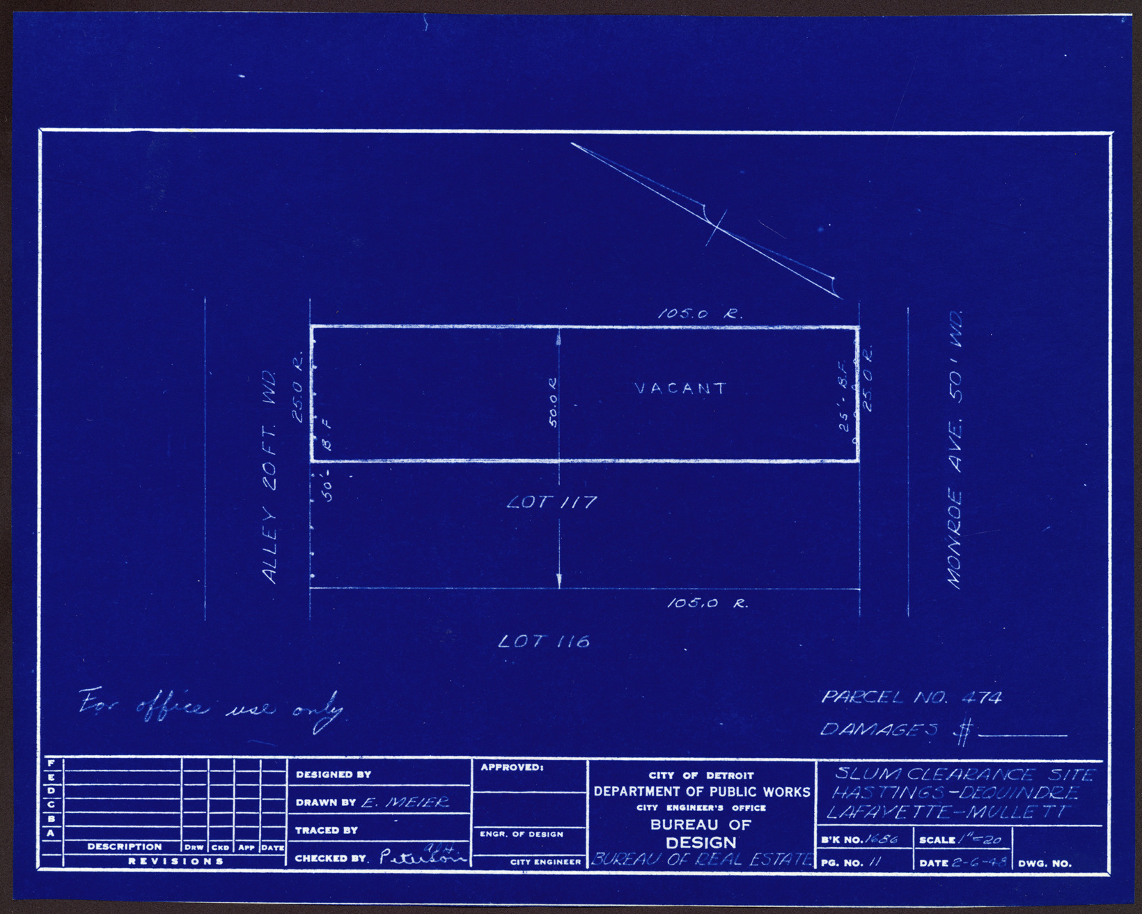 Part of a collection that contains condemnation files, photographs, blueprints and descriptions of slum clearance housing parcels for the City of Detroit. Of particular note are areas which included the neighborhoods known as Paradise Valley, Black Bottom, Corktown and the Jeffries Housing Project.