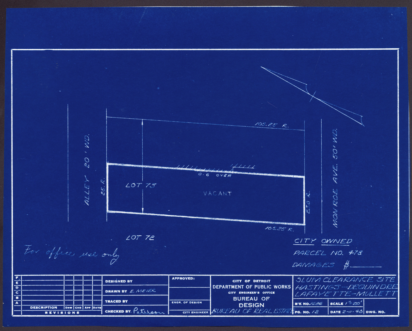Plot plan for property located on Monroe, city owned parcel 478. Recorded on blueprint: "Slum clearance site; Hastings, Dequindre, Lafayette, Mullett."