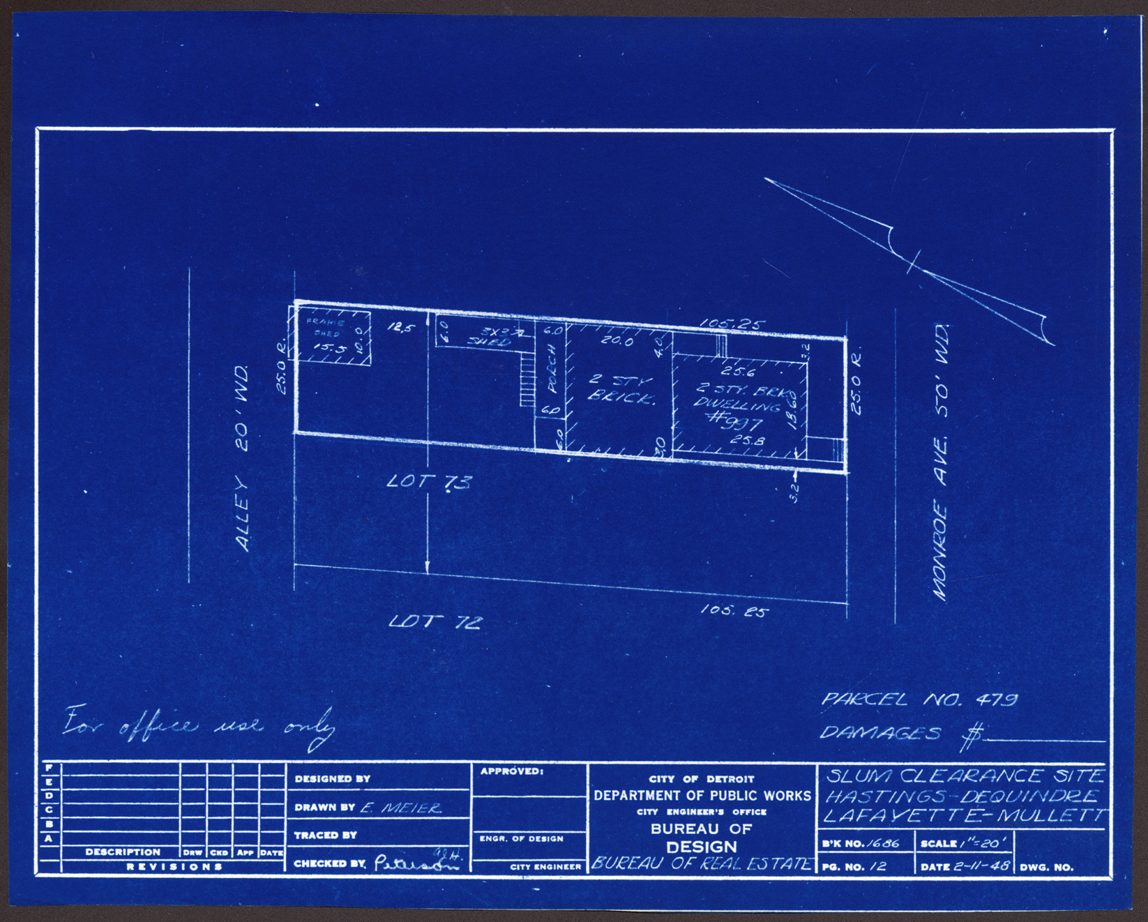 Plot plan for property located on Monroe, parcel 479. Recorded on blueprint: "Slum clearance site; Hastings, Dequindre, Lafayette, Mullett."
