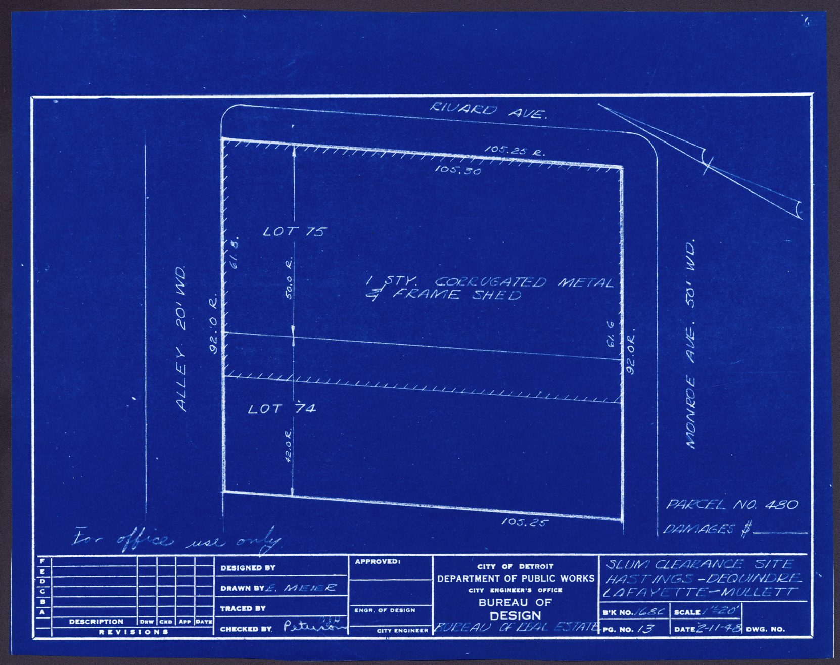 Part of a collection that contains condemnation files, photographs, blueprints and descriptions of slum clearance housing parcels for the City of Detroit. Of particular note are areas which included the neighborhoods known as Paradise Valley, Black Bottom, Corktown and the Jeffries Housing Project.