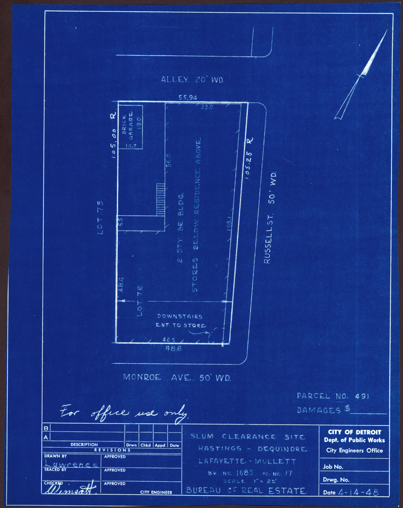 Plot plan for property located on the corner of Monroe and Russell, parcel 491. Recorded on blueprint: "Slum clearance site; Hastings, Dequindre, Lafayette, Mullett."
