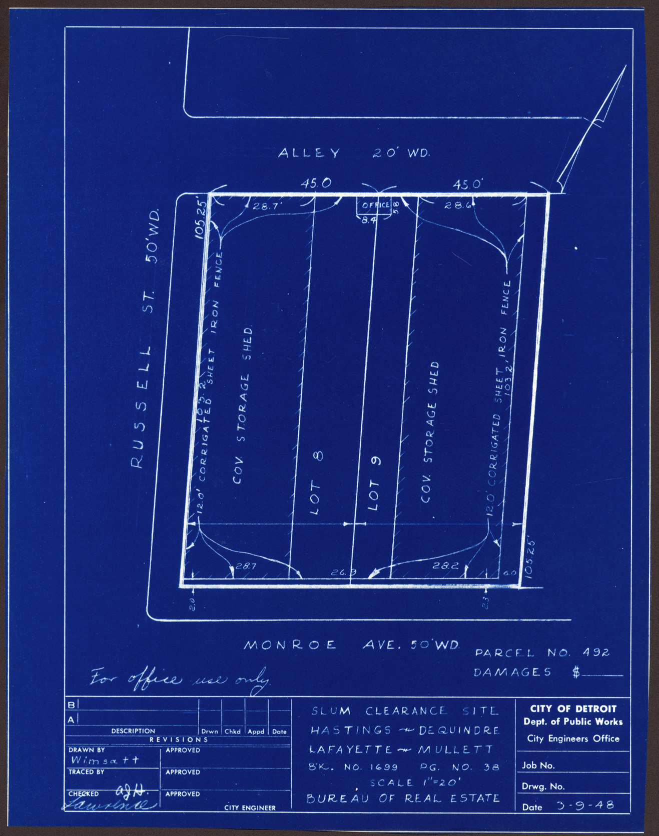 Plot plan for property located on the corner of Monroe and Russell, parcel 492. Recorded on blueprint: "Slum clearance site; Hastings, Dequindre, Lafayette, Mullett."