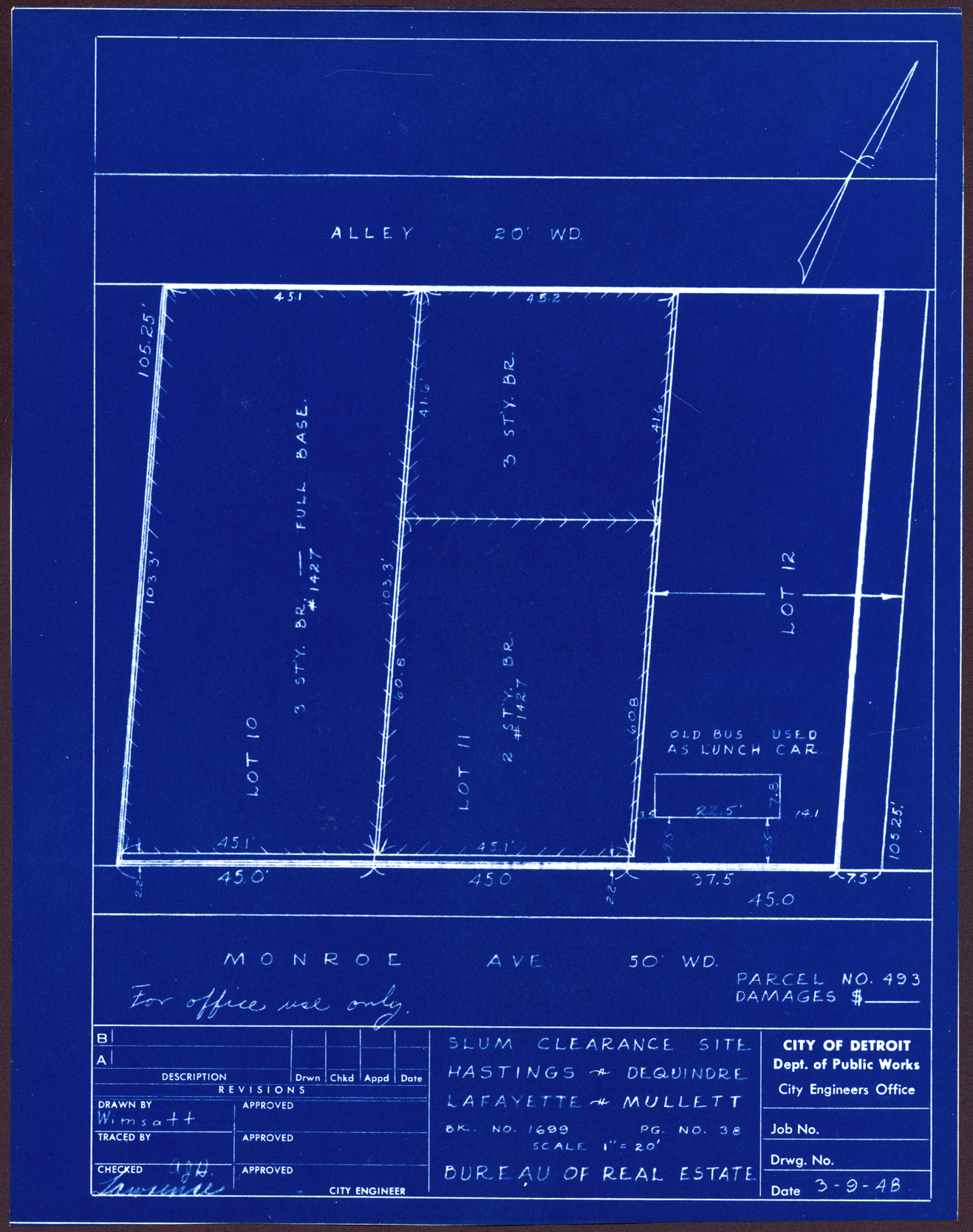 Plot plan for property located on Monroe, parcel 493. Recorded on blueprint: "Slum clearance site; Hastings, Dequindre, Lafayette, Mullett."