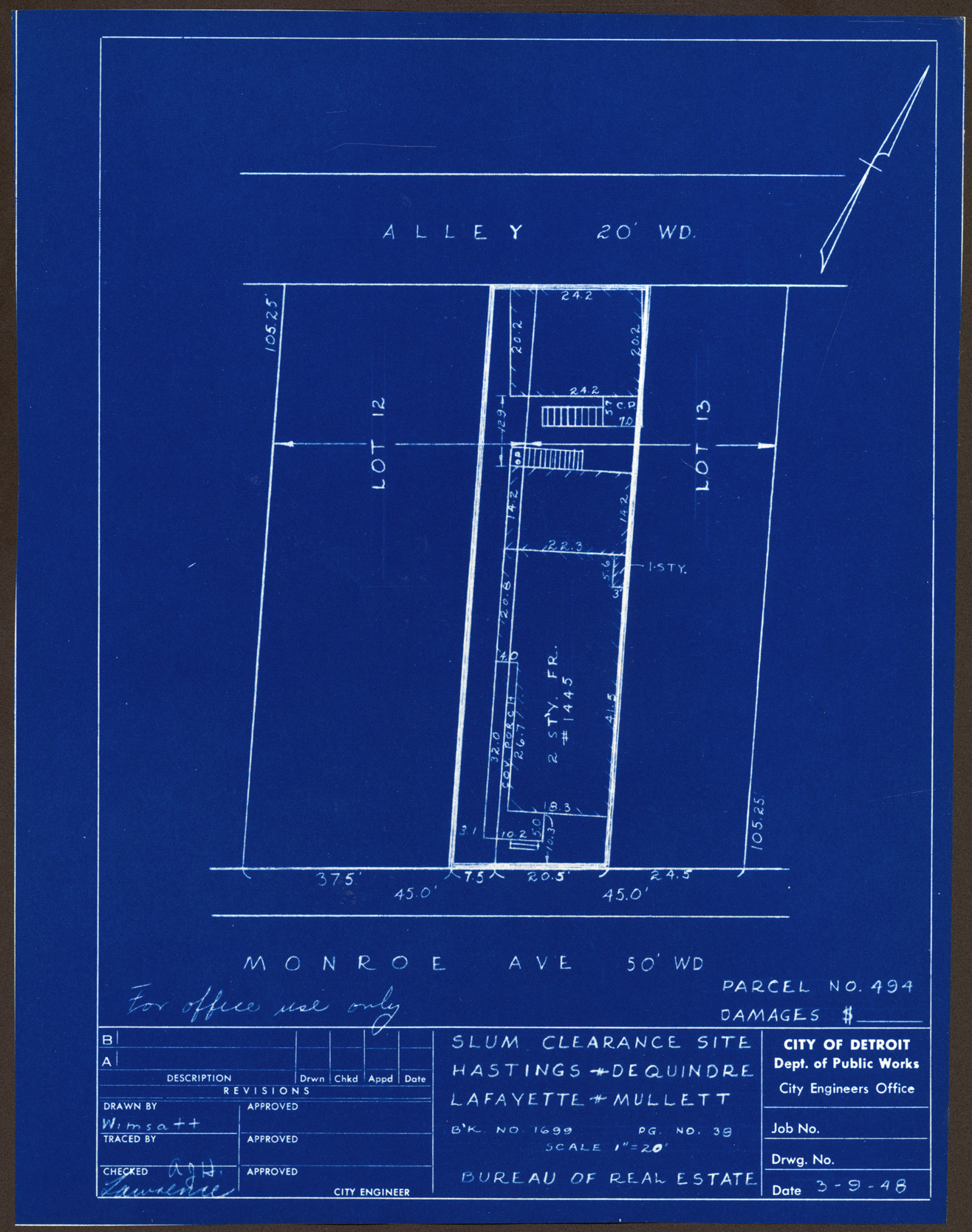 Part of a collection that contains condemnation files, photographs, blueprints and descriptions of slum clearance housing parcels for the City of Detroit. Of particular note are areas which included the neighborhoods known as Paradise Valley, Black Bottom, Corktown and the Jeffries Housing Project.