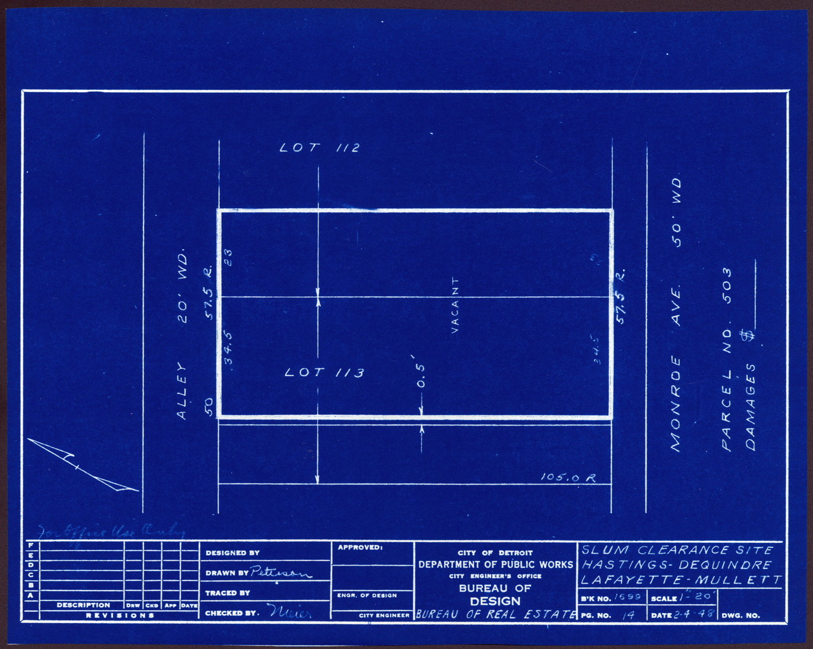Part of a collection that contains condemnation files, photographs, blueprints and descriptions of slum clearance housing parcels for the City of Detroit. Of particular note are areas which included the neighborhoods known as Paradise Valley, Black Bottom, Corktown and the Jeffries Housing Project.