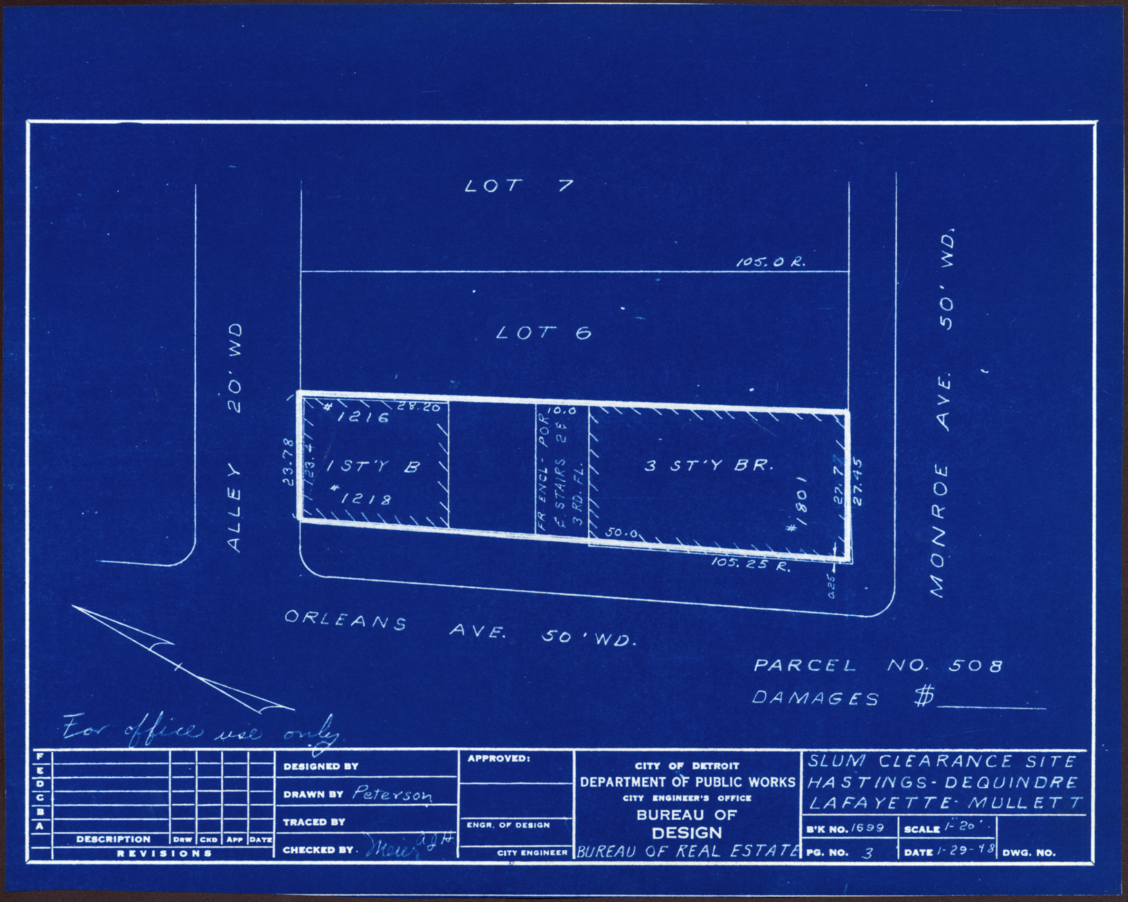 Plot plan for property located on the corner of Monroe and Orleans, parcel 508. Recorded on blueprint: "Slum clearance site; Hastings, Dequindre, Lafayette, Mullett."