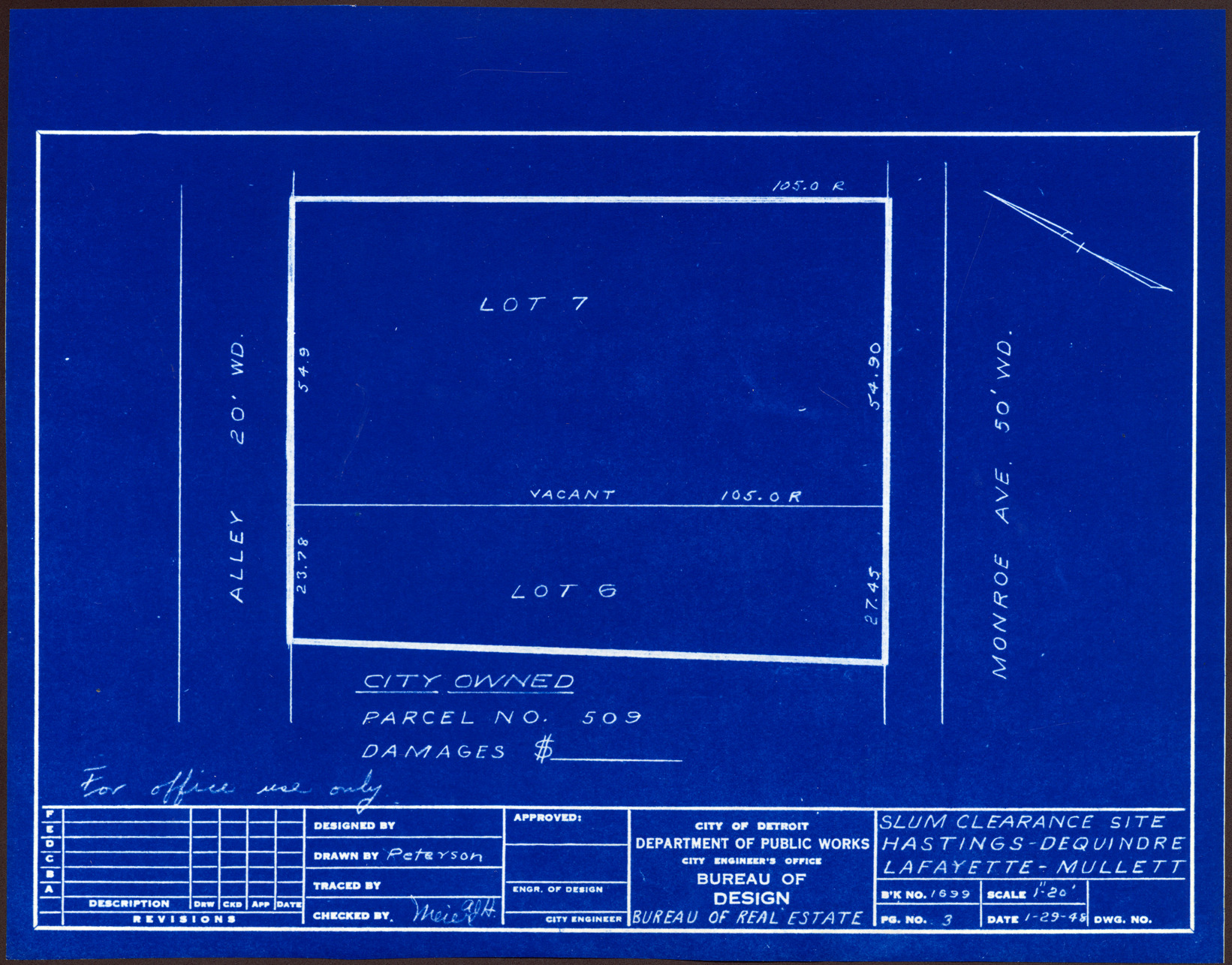 Plot plan for property located on Monroe, city owned parcel 509. Recorded on blueprint: "Slum clearance site; Hastings, Dequindre, Lafayette, Mullett."
