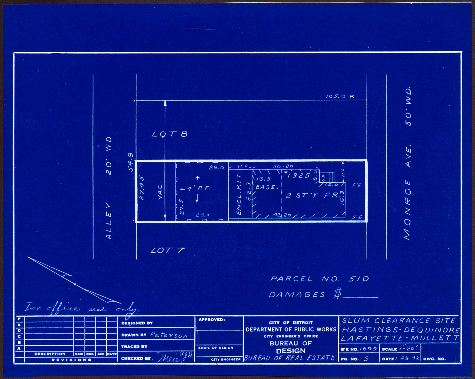 Part of a collection that contains condemnation files, photographs, blueprints and descriptions of slum clearance housing parcels for the City of Detroit. Of particular note are areas which included the neighborhoods known as Paradise Valley, Black Bottom, Corktown and the Jeffries Housing Project.
