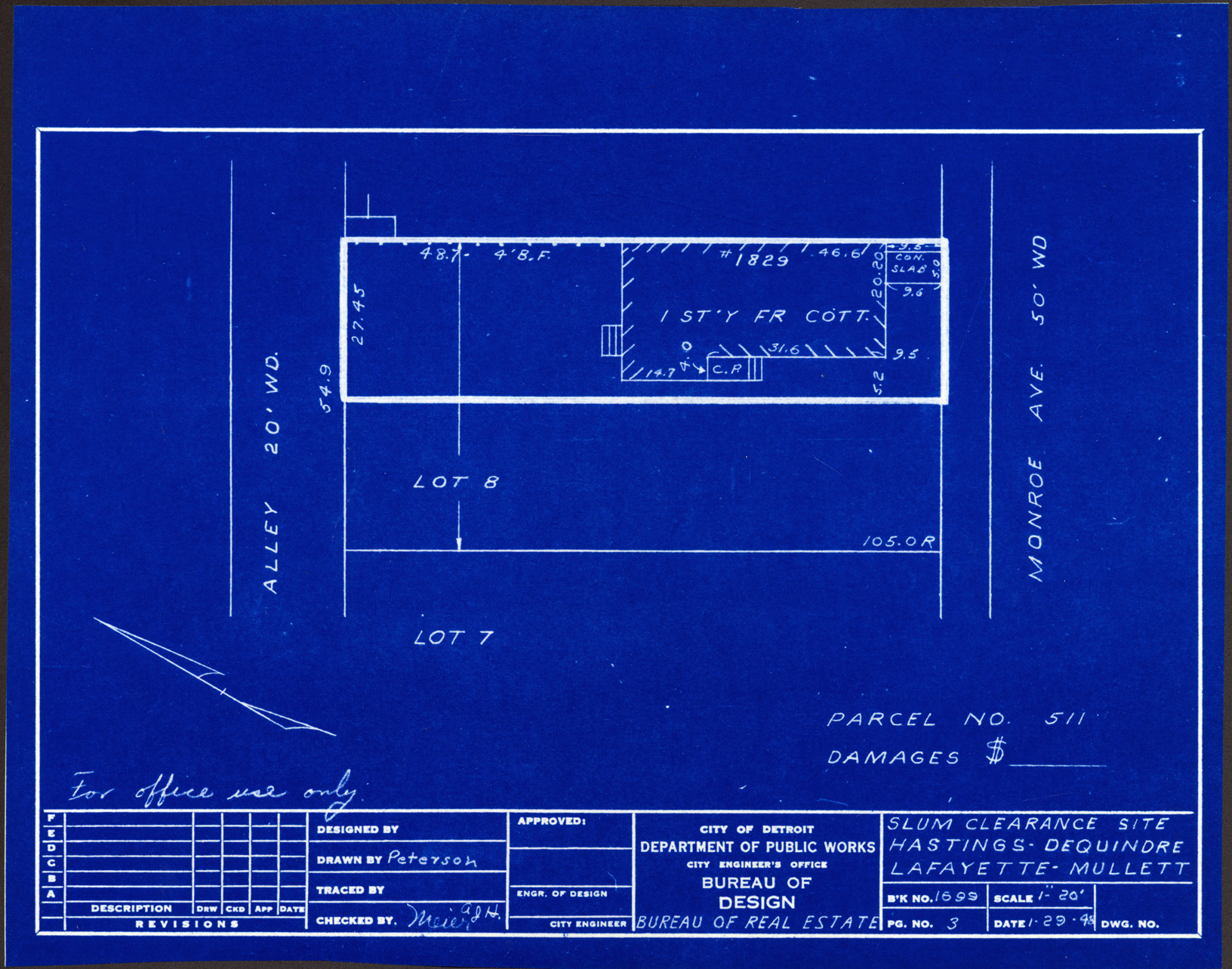Part of a collection that contains condemnation files, photographs, blueprints and descriptions of slum clearance housing parcels for the City of Detroit. Of particular note are areas which included the neighborhoods known as Paradise Valley, Black Bottom, Corktown and the Jeffries Housing Project.