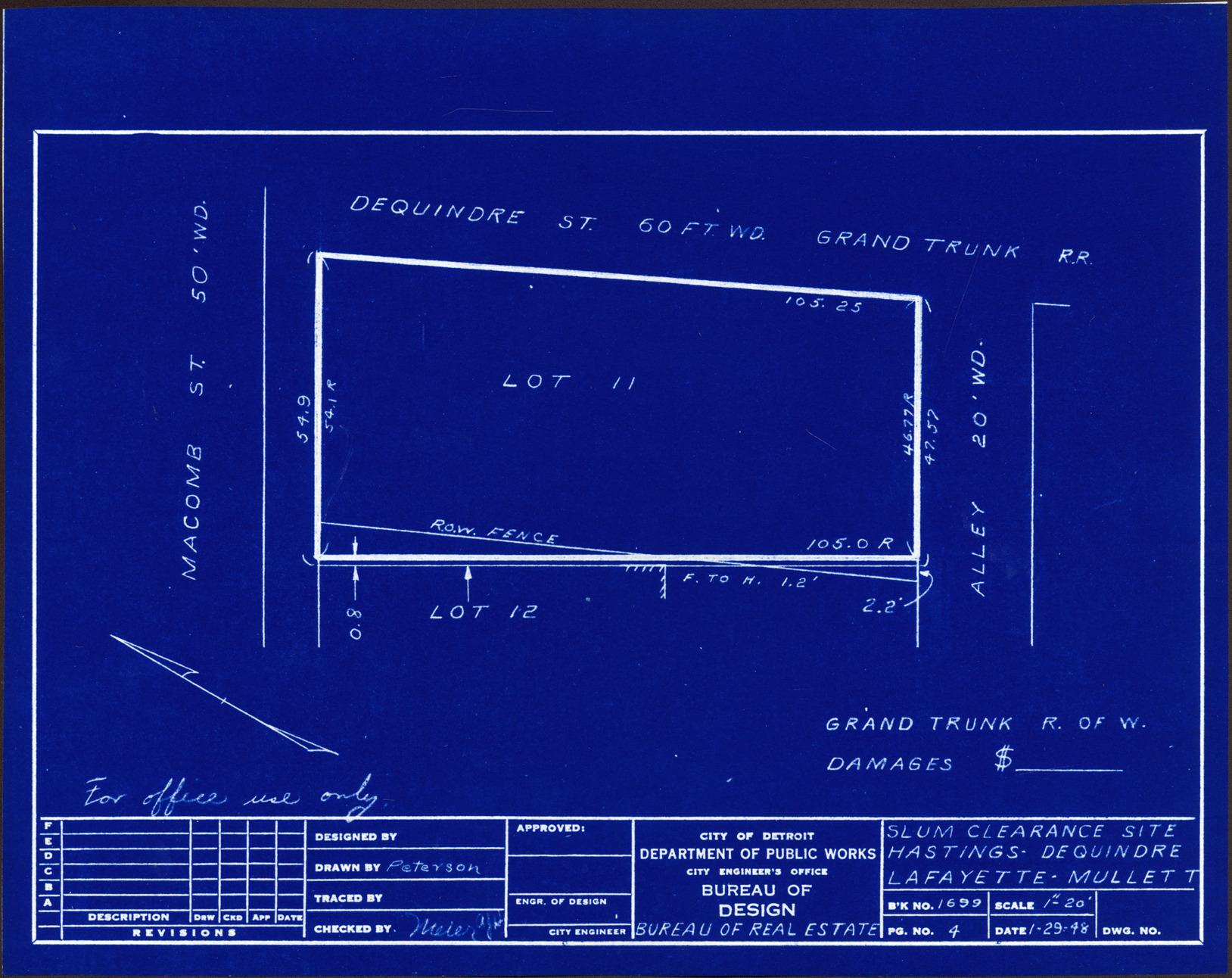 Plot plan for property located on the corner of Macomb and Dequindre, Grand Trunk R. of W. Recorded on blueprint: "Slum clearance site; Hastings, Dequindre, Lafayette, Mullett."