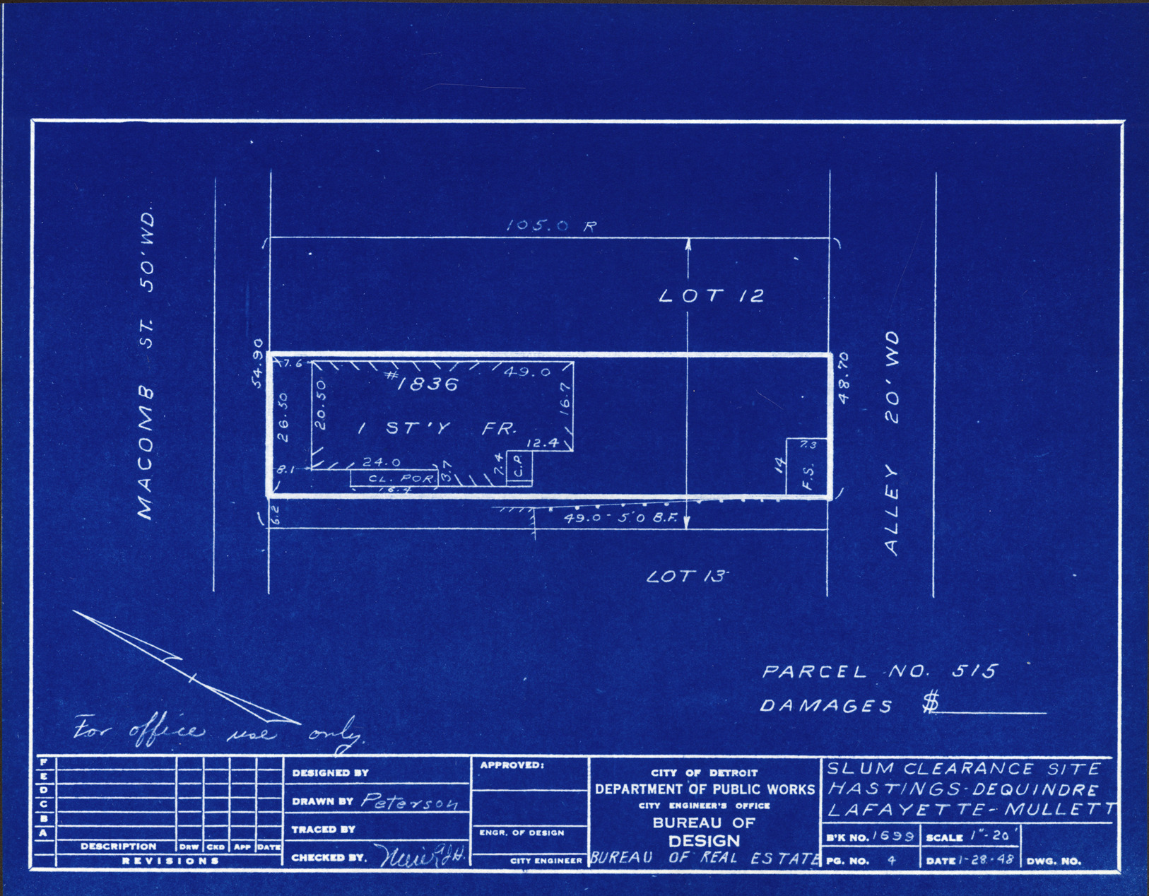 Plot plan for property located on Macomb, parcel 515. Recorded on blueprint: "Slum clearance site; Hastings, Dequindre, Lafayette, Mullett."