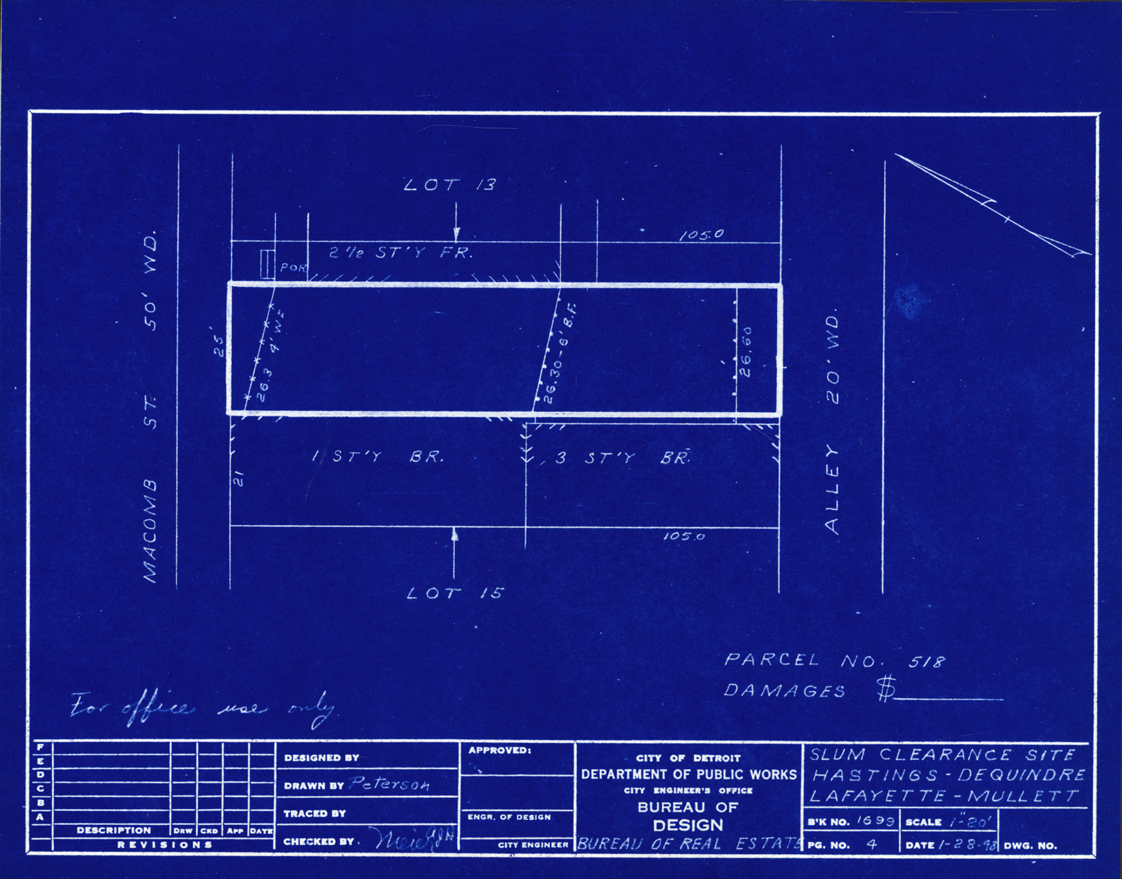 Plot plan for property located on Macomb, parcel 518. Recorded on blueprint: "Slum clearance site; Hastings, Dequindre, Lafayette, Mullett."