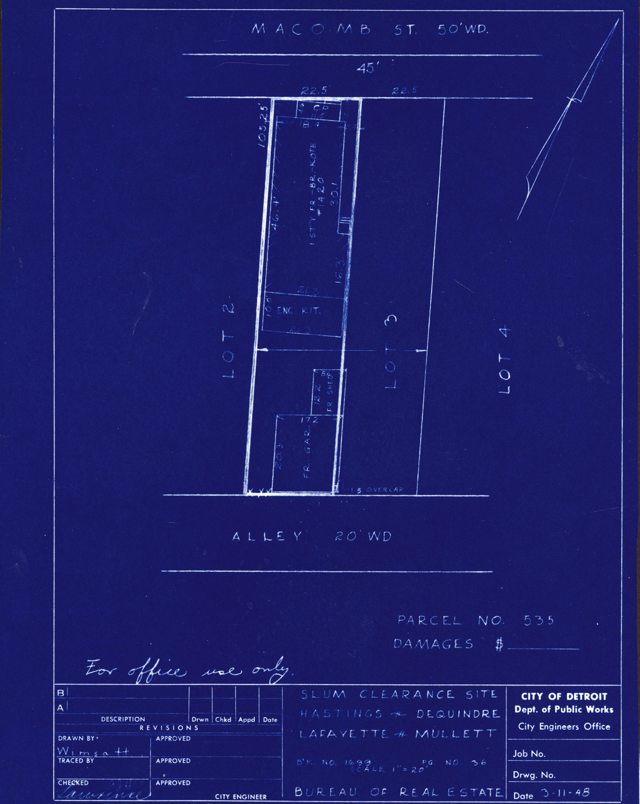 Part of a collection that contains condemnation files, photographs, blueprints and descriptions of slum clearance housing parcels for the City of Detroit. Of particular note are areas which included the neighborhoods known as Paradise Valley, Black Bottom, Corktown and the Jeffries Housing Project.