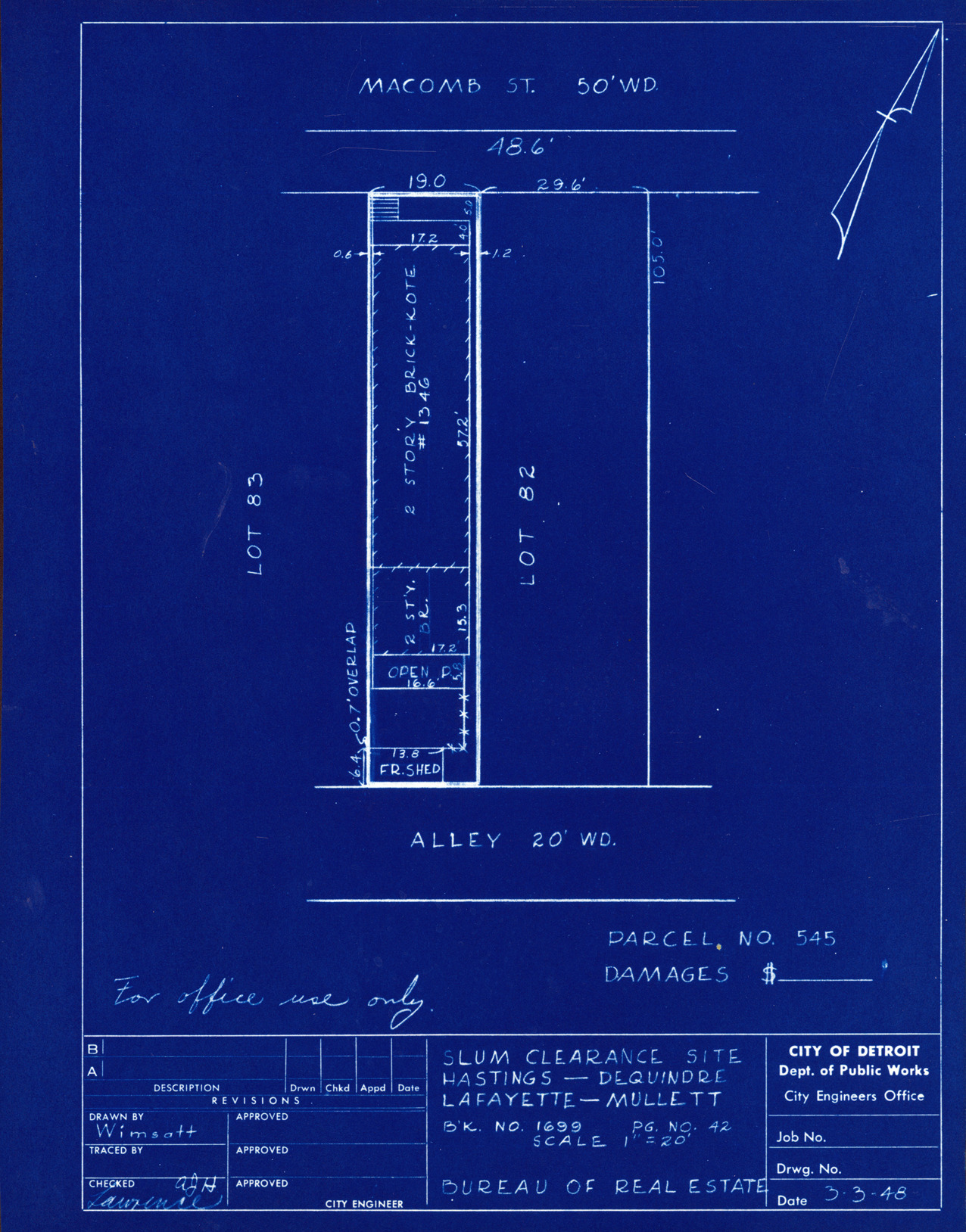 Part of a collection that contains condemnation files, photographs, blueprints and descriptions of slum clearance housing parcels for the City of Detroit. Of particular note are areas which included the neighborhoods known as Paradise Valley, Black Bottom, Corktown and the Jeffries Housing Project.