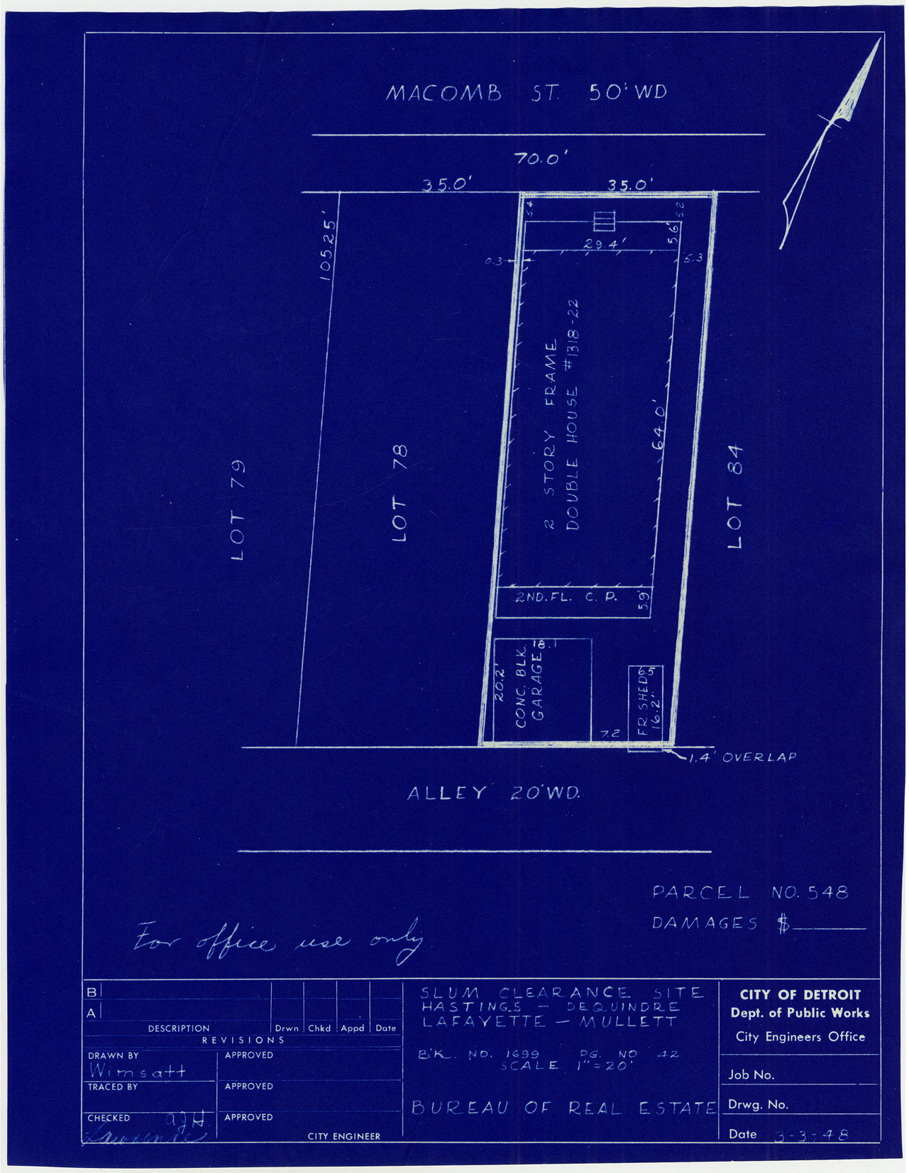 Part of a collection that contains condemnation files, photographs, blueprints and descriptions of slum clearance housing parcels for the City of Detroit. Of particular note are areas which included the neighborhoods known as Paradise Valley, Black Bottom, Corktown and the Jeffries Housing Project.