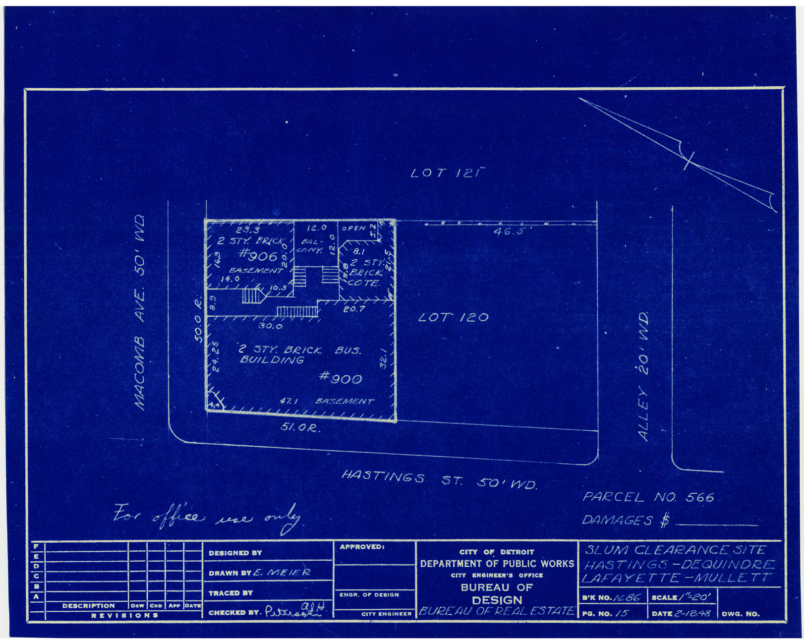 Plot plan for property located on the corner of Hastings and Macomb, parcel 566. Recorded on blueprint: "Slum clearance site; Hastings, Dequindre, Lafayette, Mullett."