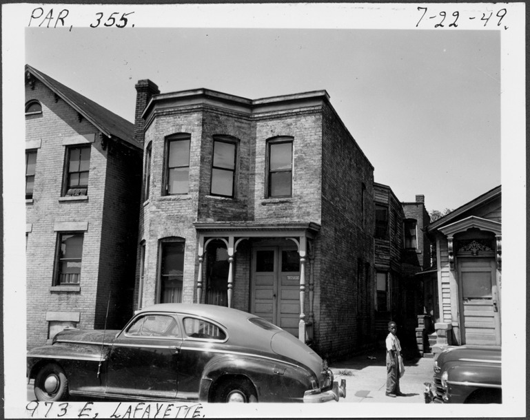 View of two-story brick house with flat roof and covered entry porch located at 973 E. Lafayette, parcel 355, in the area bounded by Hastings/Dequindre/Lafayette/Monroe. Young boy stands on sidewalk. Handwritten on front: "Par. 355, 973 E. Lafayette, 7-22-49."