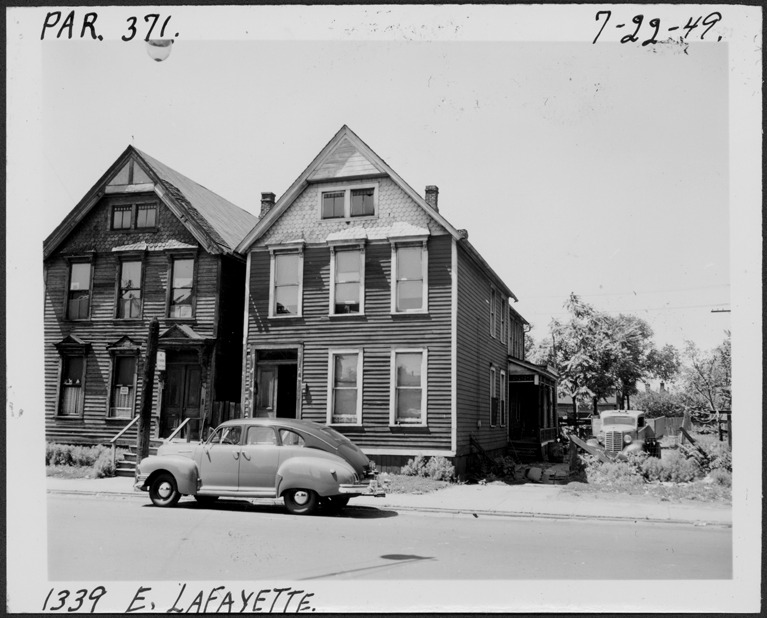 View of two-story front-gabled wooden-frame house located at 1339 E. Lafayette, parcel 371, in the area bounded by Hastings/Dequindre/Lafayette/Monroe. Front gable has decorative shingles; car parked in street. Handwritten on front: "Par. 371, 1339 E. Lafayette, 7-22-49."