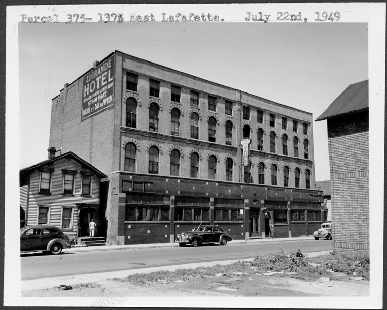 View of four-story brick and stone building located at 1375 E. Lafayette, parcel 375, in the area bounded by Hastings/Dequindre/Lafayette/Monroe. Hotel has rounded arch windows on second and third floor; car parked in street. Painted on side of building: "LeGrande Hotel, hot & cold water in every room, steam heat, rooms by day or week." Man stands on porch of adjacent residence at 1361 E. Lafayette. Typed on front: "Parcel 375, 1375 East Lafayette, July 22nd, 1949."