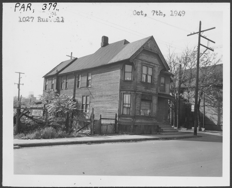 Front and side view of two-story front-gabled wooden-frame house located at 1027 Russell, parcel 379, in the area bounded by Hastings/Dequindre/Lafayette/Monroe. Lot with fence adjacent to house. Handwritten on front: "Parcel 379." Typed on front: "1027 Russell, Oct. 7th, 1949."