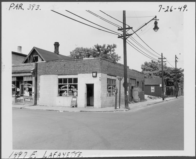 View of one-story brick and concrete block building located at 1497 E. Lafayette, parcel 393, in the area bounded by Hastings/Dequindre/Lafayette/Monroe. Sign in window: "E. Singleton & Sons, cleaners & dyers, 4 hr. service." Detroit Times newsstand on corner. Handwritten on front: "Par. 393, 1497 E. Lafayette, 7-26-49."