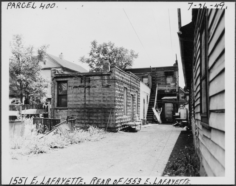 View of one-story stone or concrete house with flat roof located at 1551 E. Lafayette, parcel 400, in the area bounded by Hastings/Dequindre/Lafayette/Monroe. Residence is a rear addition to building at 1553 E. Lafayette. Handwritten on front: "Par. 400, 1551 E. Lafayette, rear of 1553 E. Lafayette, 7-26-49."