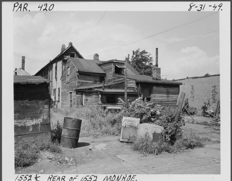 View of wooden-frame house with irregular roof line located at 1552-1/2 Monroe, at the rear of 1552 Monroe, parcel 420, in the area bounded by Hastings/Dequindre/Lafayette/Monroe. Trash barrel and trash bins in foreground. Handwritten on front: "Par. 420, 1552-1/2, rear of 1552 Monroe, 8-31-49."