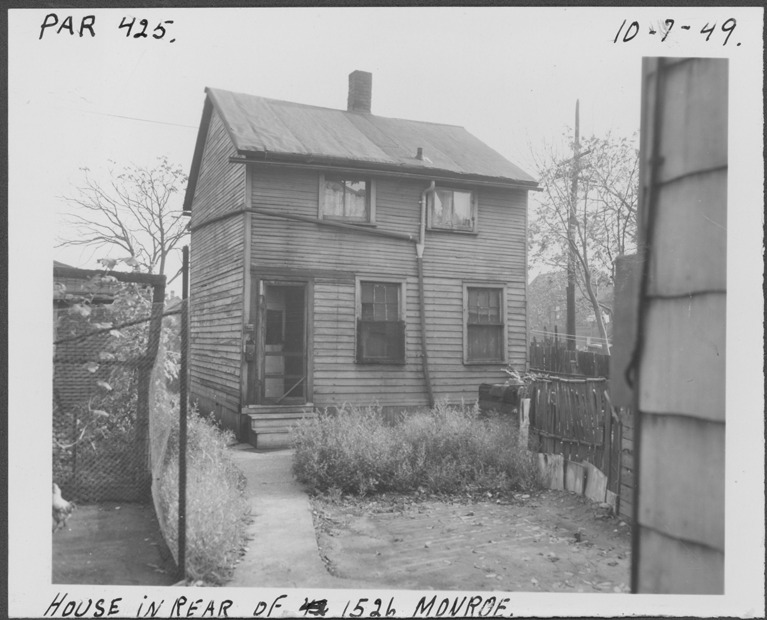 View of two-story side-gabled wooden-frame house located at the rear of 1526 Monroe, parcel 425, in the area bounded by Hastings/Dequindre/Lafayette/Monroe. Handwritten on front: "Par. 425, house in rear of 1526 Monroe, 10-7-49."