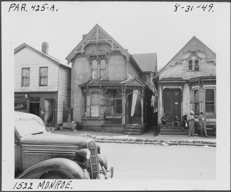 View of two-story wooden-frame Victorian style house located at 1522 Monroe, parcel 425A, in the area bounded by Hastings/Dequindre/Lafayette/Monroe. Group of men gather in front of adjacent residence. Handwritten on front: "Par. 425-A, 1522 Monroe, 8-31-49."