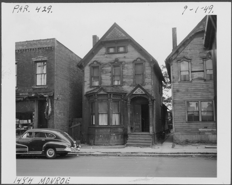 View of two-story front-gabled wooden-frame house with bay window located at 1484 Monroe, parcel 429, in the area bounded by Hastings/Dequindre/Lafayette/Monroe. Automobile parked in street. Handwritten on front: "Par. 429, 1484 Monroe, 9-1-49."