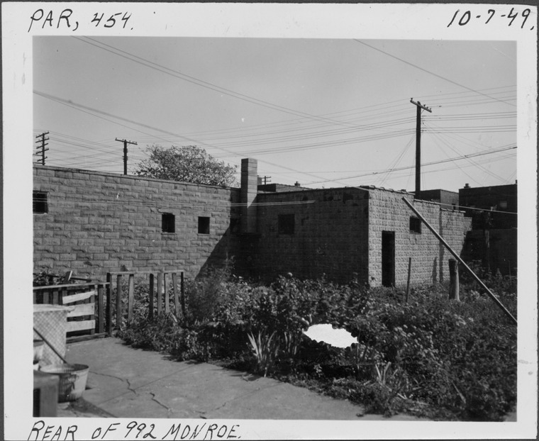 Rear view of one-story cement garage located at 992 Monroe, parcel 454, in the area bounded by Hastings/Dequindre/Lafayette/Monroe. Overgrown weeds grow behind building next to concrete walkway. Handwritten on front: "Par. 454, rear of 992 Monroe, 10-7-49." Surface of photograph is damaged.