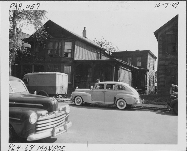 View of two-story wooden-frame house with one-story wing located at 914-918 Monroe, parcel 457, in the area bounded by Hastings/Dequindre/Lafayette/Monroe. Cars and truck parked in street. Handwritten on front: "Par. 457, 974 Monroe, 10-7-49."